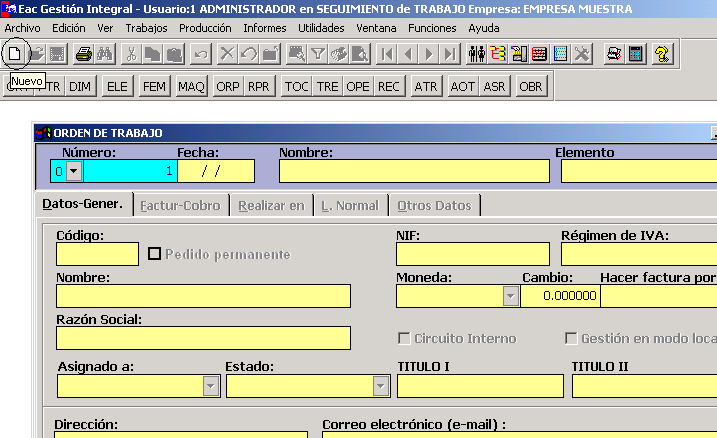 En este punto nos aparecerá el formulario correspondiente a una orden de trabajo. Para crear una nueva hay que hacer clic sobre el botón “Nuevo” o pulsar la combinación de teclas Ctrl+N.