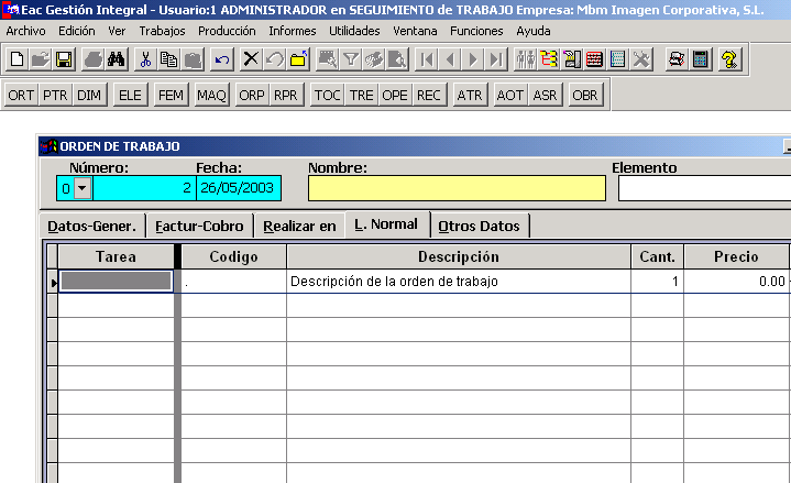 Para poder guardar la orden de trabajo, es necesario que introduzcamos al menos una línea de detalle. Esto se hace desde la pestaña “L. Normal”. En esta pestaña tenemos que hacer clic sobre el botón “Nuevo” o pulsar Ctrl+N para poder añadir una línea. En estas líneas podemos imputar costes directamente a la Orden de Trabajo. En el ejemplo, hemos añadido simplemente una línea de descripción (para ello es necesario poner un punto “.” en el campo “Código”):