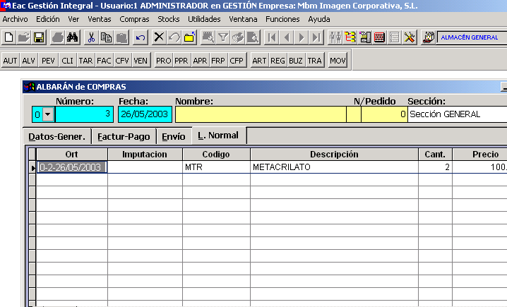 Podemos imputar el coste de la compra de materiales a una ORT. Para ello tenemos que vincular las líneas de los pedidos o los albaranes de compras a la ORT (en el ejemplo lo haremos con un albarán). Esto se hace desde el módulo de Gestión. Por tanto, tenemos que ir al módulo de Gestión y una vez allí acceder al formulario de albaranes de compras haciendo clic en el botón “APR”.