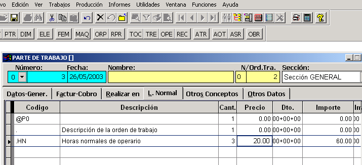 Ahora podemos ir a la pestaña “L. Normal” y ver que nos aparecen las líneas de la orden de trabajo. Aparte de éstas, se pueden añadir más con Ctrl+N (o clicando sobre “Nuevo”). También se pueden modificar las líneas importadas. En nuestro ejemplo, hemos añadido una línea con horas de operario a las que le hemos puesto cantidad, precio y coste.