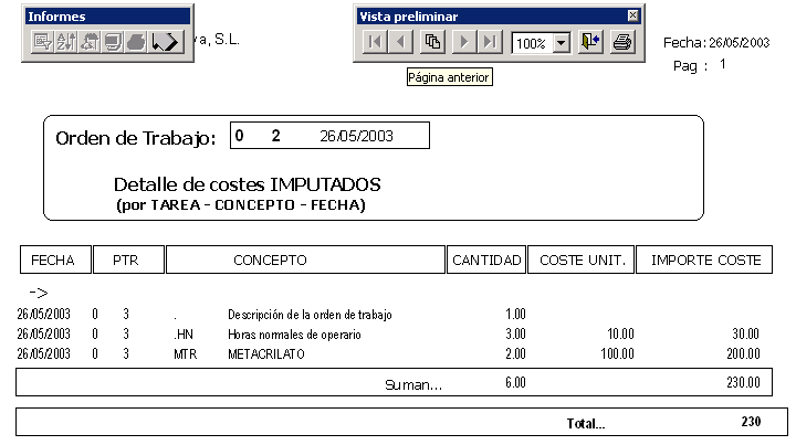 Como se puede observar, en el informe se reflejan las líneas introducidas directamente en la ORT, los materiales imputados mediante el albarán y las horas de operario asignadas en el parte de trabajo relacionado con la ORT.
